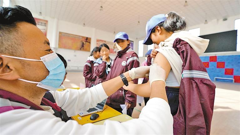接種疫苗后,醫(yī)生在留觀區(qū)為學(xué)生測量體溫。記者 格桑倫珠 攝