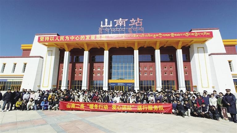 山南市第二高級(jí)中學(xué)“暖冬行動(dòng) 愛心送站”送行服務(wù)隊(duì)和學(xué)生們合影。 圖由格桑央金提供