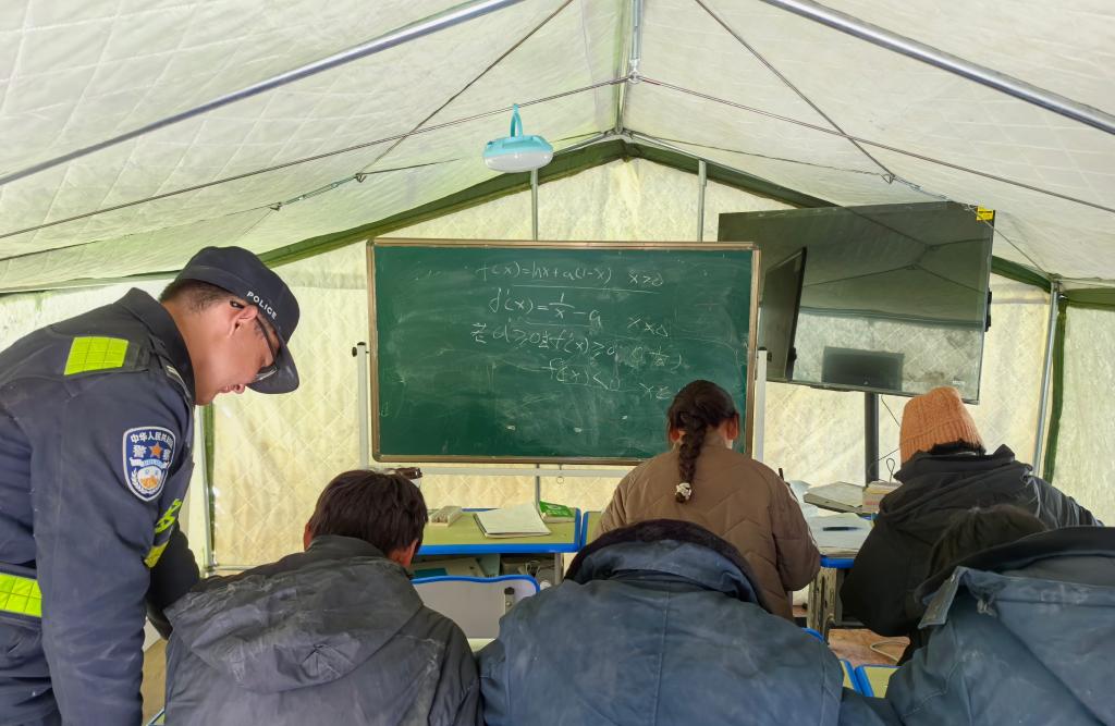 在西藏日喀則市定日縣長所鄉(xiāng)嘎布村安置點(diǎn)的帳篷內(nèi),民警劉鑫磊一手指了指黑板上的題目,一手拿著資料,耐心地給高三學(xué)生講解。5名學(xué)生坐在課桌前,低著頭,快速地在草稿紙上演算著。