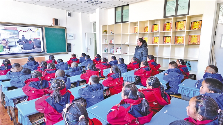 隨后,在定日縣委黨校禮堂里,北京市八一學(xué)校和成都市錦江區(qū)嘉祥外國(guó)語(yǔ)學(xué)校的視頻畫面切入大屏幕,長(zhǎng)所鄉(xiāng)小學(xué)學(xué)生代表和他們一起隨著歌曲節(jié)奏,聲音嘹亮地唱著:“穿過(guò)風(fēng)和雨,我想要把未來(lái)點(diǎn)亮……”稚嫩的童聲與千里之外的同齡人同頻共振,一首《把未來(lái)點(diǎn)亮》響徹云霄。“定日縣地震剛發(fā)生,北京市八一學(xué)校和四川省成都市錦江區(qū)嘉祥外國(guó)語(yǔ)學(xué)校第一時(shí)間給災(zāi)區(qū)的學(xué)生捐款捐物,北京市八一學(xué)校學(xué)生給大家畫了畫、寄了賀卡,還錄制了一首叫《讓世界充滿愛(ài)》的歌曲來(lái)鼓勵(lì)震區(qū)的孩子們。所以這次‘開(kāi)學(xué)第一課’,選擇了這首《把未來(lái)點(diǎn)亮》來(lái)視頻連線合唱?!蔽鞑刈灾螀^(qū)教育廳思政處副處長(zhǎng)韓利君介紹說(shuō)。