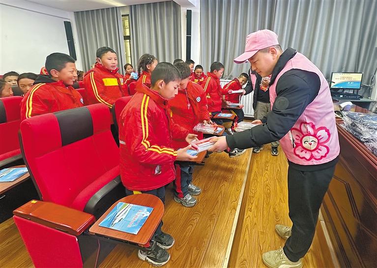 圖為工作人員給孩子們發(fā)放相關(guān)宣傳手冊(cè)。 拉巴次仁 記者 旦增蘭澤 攝