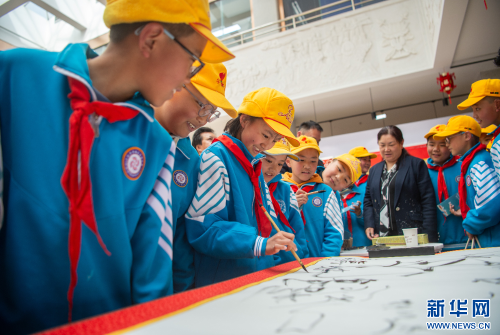 4月9日,拉薩市城關(guān)區(qū)雪小學(xué)學(xué)生在西藏自治區(qū)圖書館讀書活動(dòng)現(xiàn)場體驗(yàn)書法。新華網(wǎng) 旦增努布 攝