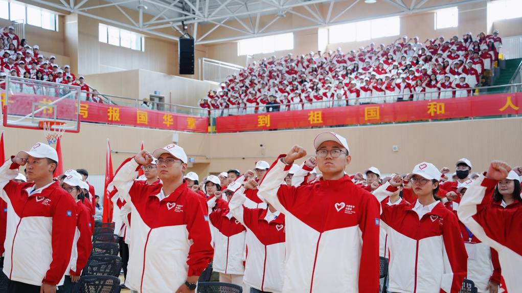 7月29日,2025年大學生志愿服務西部計劃服務西藏專項志愿者出征儀式上,志愿者們正在宣誓。 陳梟 攝