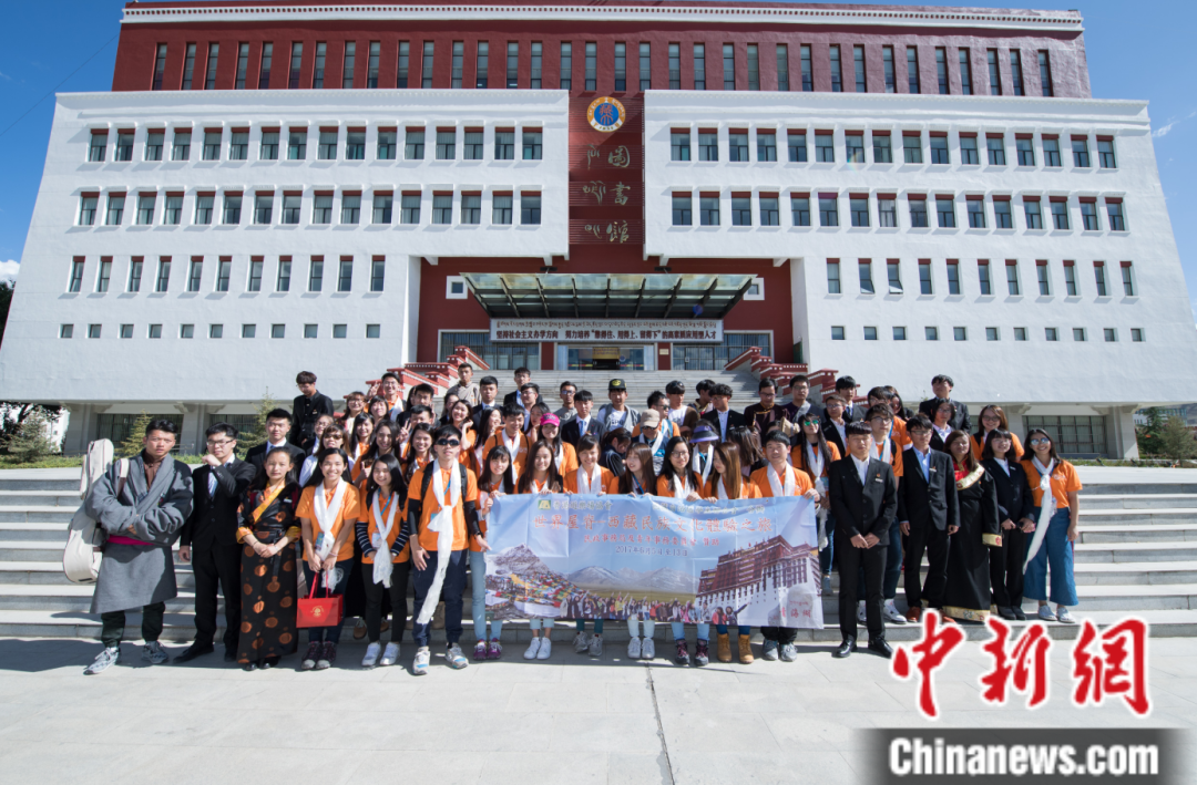 圖為2017年6月8日,香港青少年代表團與西藏大學學生代表在西藏大學圖書館前合影留念。中新社記者 何蓬磊 攝