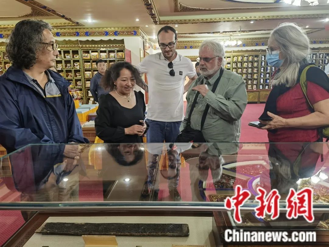 圖為2023年9月20日,外籍專家學者參觀西藏大學圖書館藏文古籍研究所。中新社記者 趙延 攝