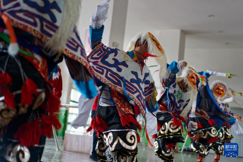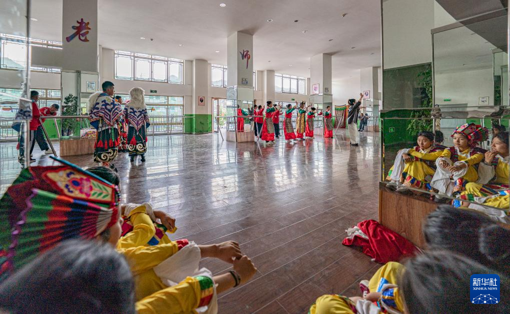 9月9日,在拉薩市第二中等職業(yè)技術(shù)學(xué)校,學(xué)生們?cè)诰毩?xí)藏戲。新華社記者 張笑宇 攝