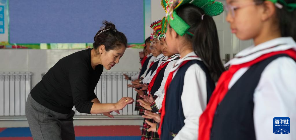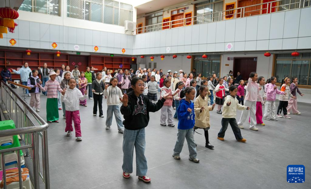 9月11日,在拉薩市實(shí)驗(yàn)小學(xué),藏戲老師指導(dǎo)孩子們練習(xí)藏戲身段動(dòng)作。新華社記者 晉美多吉 攝