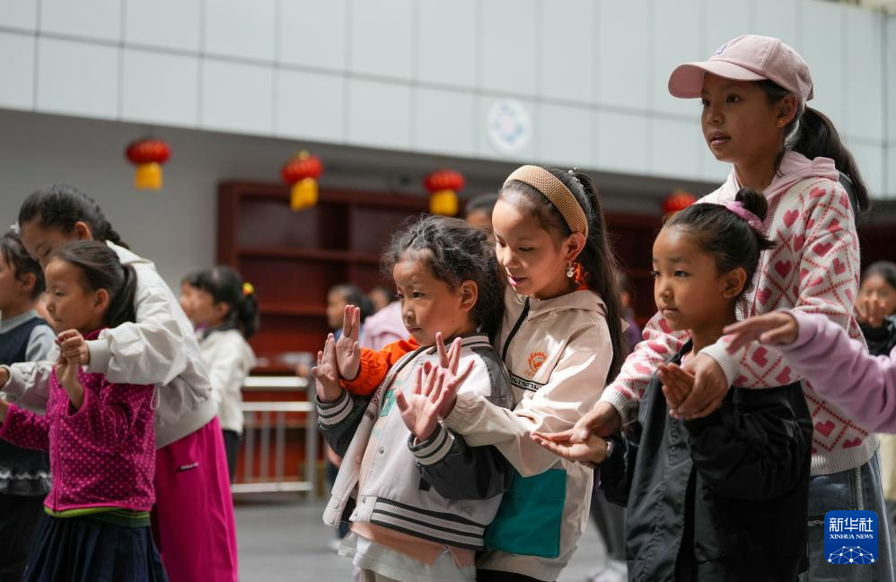 9月14日,在西藏自治區(qū)群藝館,學(xué)習(xí)藏戲的孩子們?cè)诨ハ嗉m正動(dòng)作。新華社記者 晉美多吉 攝