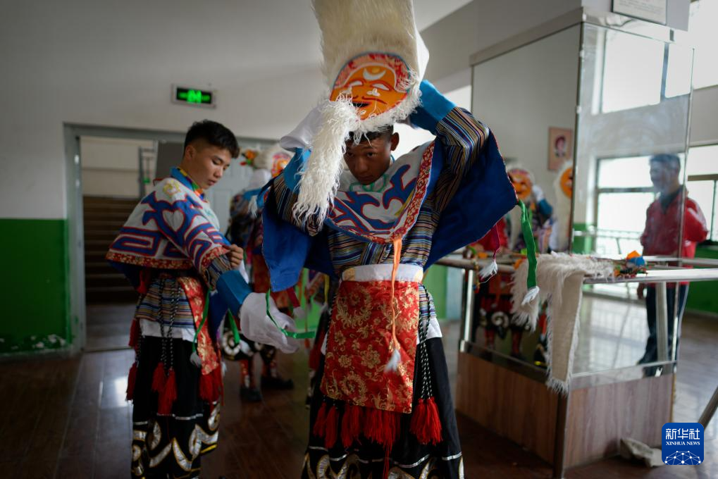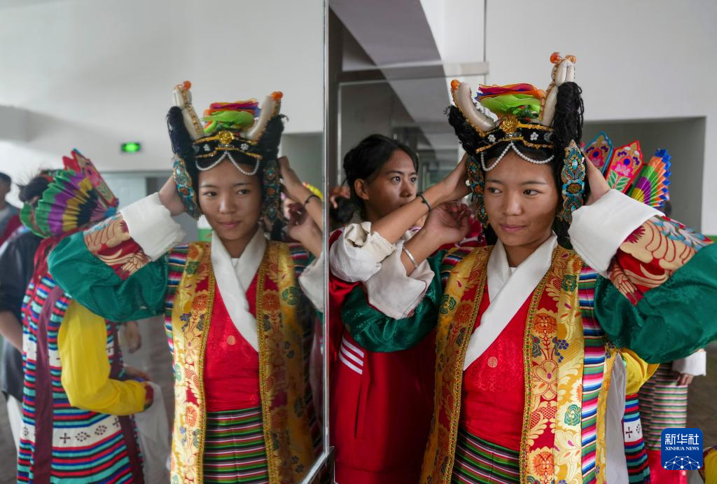 9月9日,在拉薩市第二中等職業(yè)技術(shù)學(xué)校,學(xué)生穿戴藏戲表演服飾。新華社記者 晉美多吉 攝