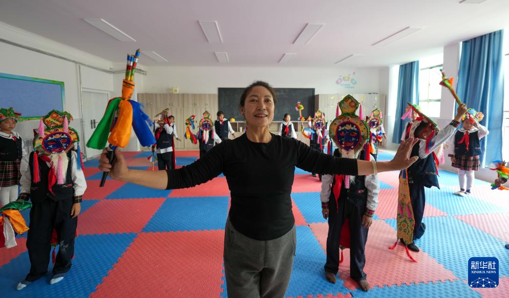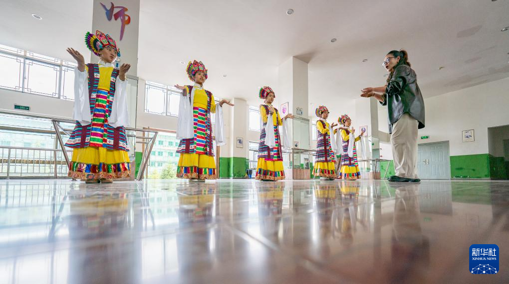9月11日,在拉薩市實(shí)驗(yàn)小學(xué),藏戲老師帶領(lǐng)孩子們練習(xí)藏戲。新華社記者 晉美多吉 攝