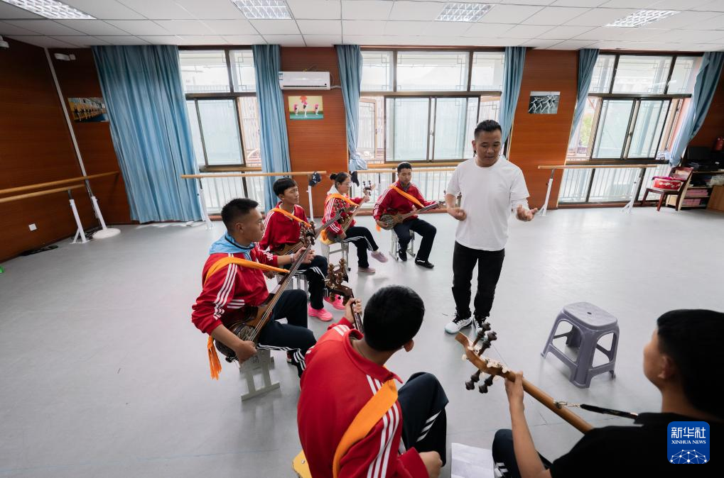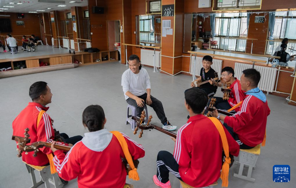 9月9日,在拉薩市第二中等職業(yè)技術學校,洛桑次仁老師在糾正孩子們彈奏扎念琴的動作。新華社記者 張笑宇 攝
