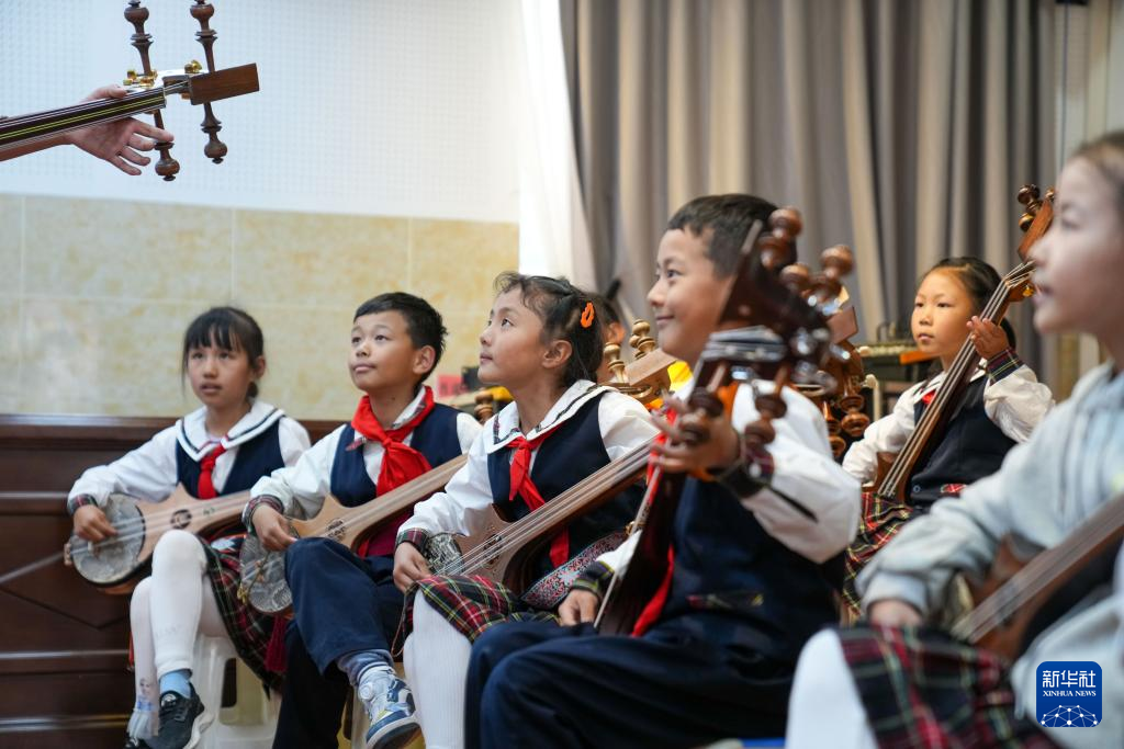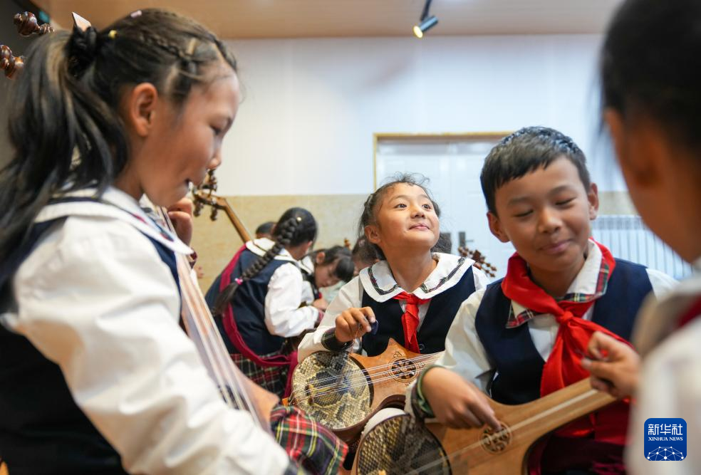 9月11日,在拉薩市實驗小學,孩子們在彈奏扎念琴。新華社記者 晉美多吉 攝