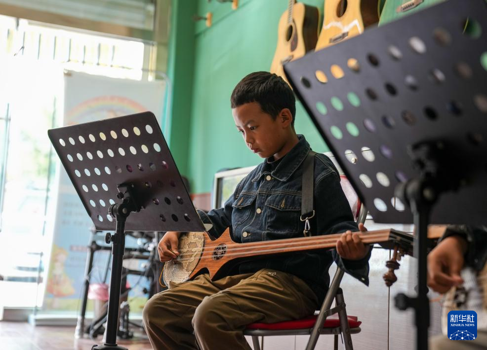 9月13日,在拉薩市古樂扎念琴行,孩子們在彈奏扎念琴。新華社記者 晉美多吉 攝