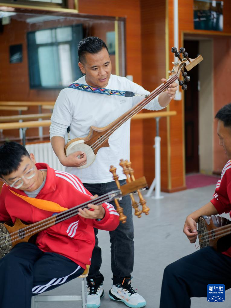 9月9日,在拉薩市第二中等職業(yè)技術學校,洛桑次仁老師在給孩子們傳授扎念琴彈奏的要領。新華社記者 丁增尼達 攝