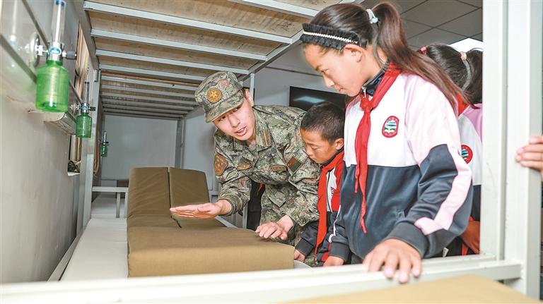 屏幕那頭,孩子們好奇地提問:“叔叔,你們那里冷嗎?”“你們那里會有高原反應嗎?”官兵們耐心解答,還特意展示了高原防寒裝具和制氧設備。