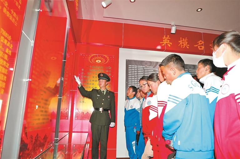 官兵帶領學生參觀紅色紀念場館。遲浩鵬 攝