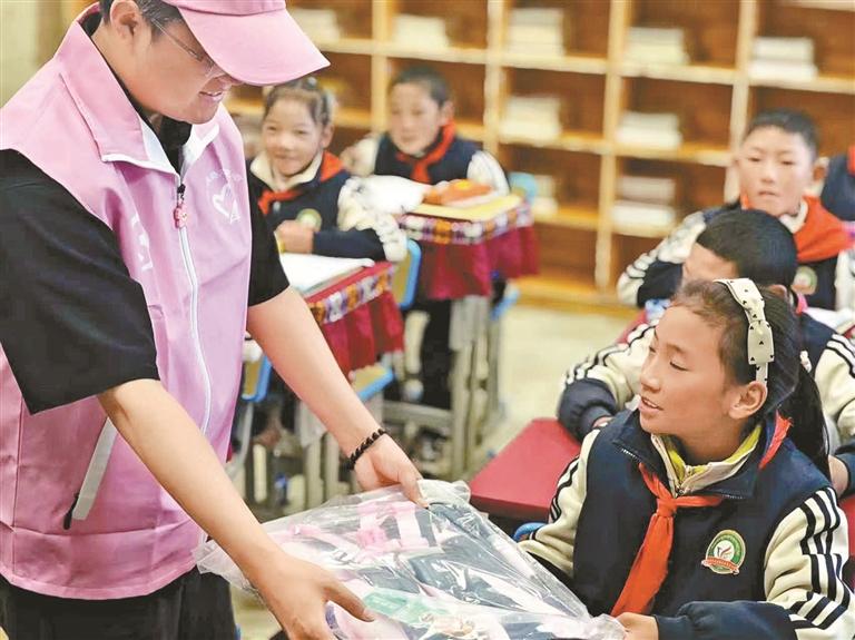 志愿者為孩子們分發(fā)小獎(jiǎng)品。記者 鹿麗娟 通訊員 格桑央珍 攝影報(bào)道