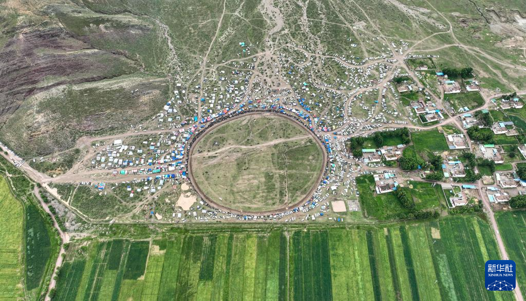 7月23日拍攝的拉薩甘丹曲果鎮(zhèn)賽馬場(chǎng)上的走馬比賽(無人機(jī)照片)。 新華社記者 晉美多吉 攝