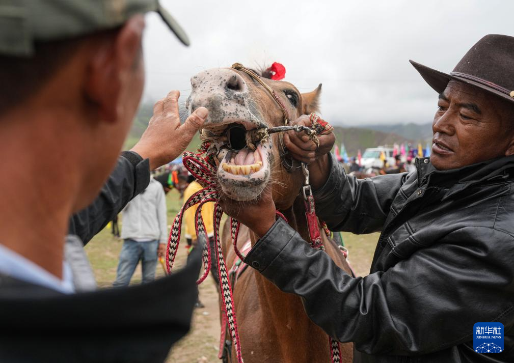7月23日,工作人員檢查馬的牙口是否符合比賽不同組別等級(jí)的劃分。 新華社記者 晉美多吉 攝