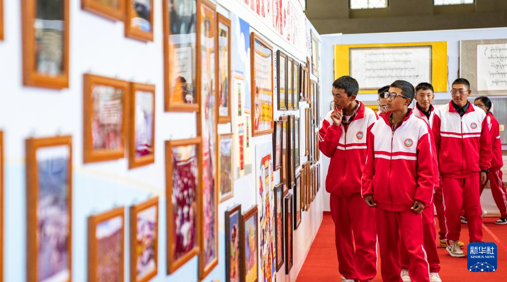 學(xué)生在西藏首屆中小學(xué)生藝術(shù)展演活動獲獎作品展廳內(nèi)參觀(9月25日攝)。新華社記者 丁增尼達(dá) 攝