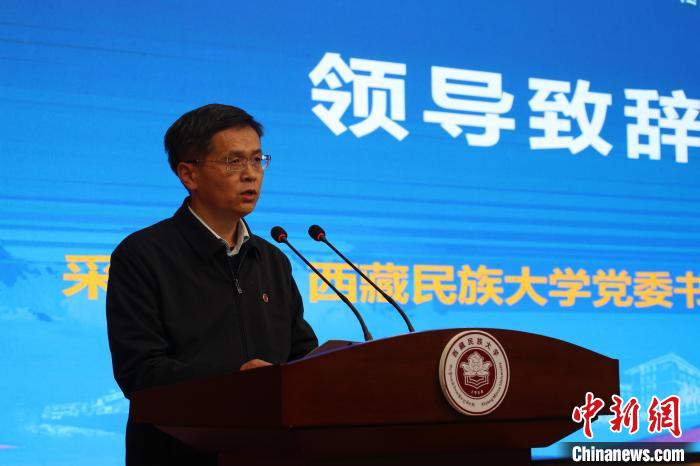 西藏民族大學(xué)黨委書記、副校長采守寬在第四屆“藏秦·喜馬拉雅”論壇開幕式發(fā)表致辭?!≈鬓k方供圖