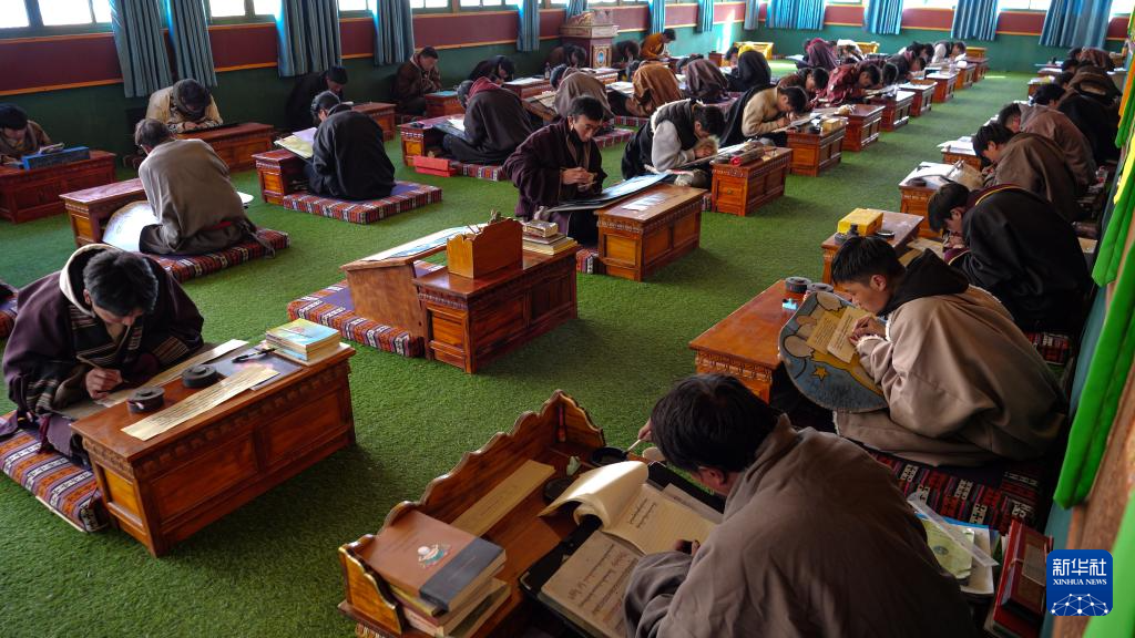 11月22日,昌都市丁青縣擁忠文化藝術(shù)中心非遺扶貧就業(yè)工坊學(xué)員在練習(xí)藏文書(shū)法。新華社記者 普布次仁 攝