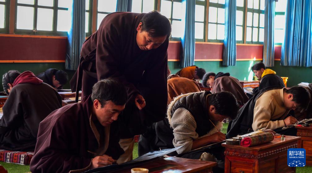 11月22日,昌都市丁青縣擁忠文化藝術(shù)中心非遺扶貧就業(yè)工坊老師在指導(dǎo)學(xué)員寫(xiě)藏文書(shū)法。新華社記者 格桑朗杰 攝