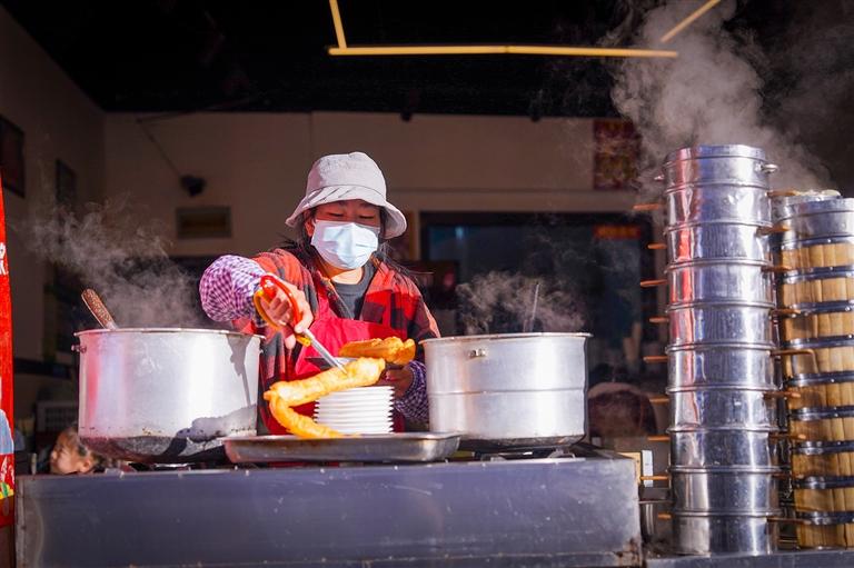 早上九點(diǎn),楊三姐的早餐店里生意正好,她一邊炸著韭菜盒子一邊忙碌地招呼著顧客?!皨輯?,幫我把油條剪成小段。”上班族劉女士來(lái)到店里,買了一份豆?jié){油條。她說(shuō):“早上冷,我喜歡把油條泡進(jìn)滾燙的豆?jié){里吃,很暖和?!闭艋\揭開(kāi),一股股蒸騰的熱氣撲面而來(lái),包子面皮軟糯,內(nèi)里餡料飽滿,趁熱咬上一口,濃郁的香味喚醒還在沉睡的味蕾。楊三姐告訴記者:“除了面點(diǎn),也有很多人愛(ài)點(diǎn)豌雜面等粉面,早上喝口熱湯才舒服?!?/p>