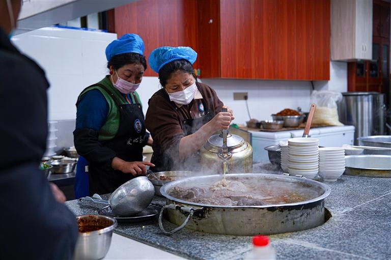 街頭的甜茶館里,時(shí)不時(shí)傳來(lái)歡聲笑語(yǔ),這里是拉薩冬日最溫暖的角落。在這里,人們臉上的笑容在氤氳的熱氣中若隱若現(xiàn),醇厚的茶香在小小的茶館內(nèi)裊裊升騰,酥油茶在長(zhǎng)柄壺中微微蕩漾,絲滑的茶水傾入食客們的木碗,泛起細(xì)膩的泡沫。此時(shí),阿佳端著一碗碗藏面上桌,質(zhì)樸的笑容驅(qū)散了冬日的寒意,溫暖著每一個(gè)過(guò)客的心房。