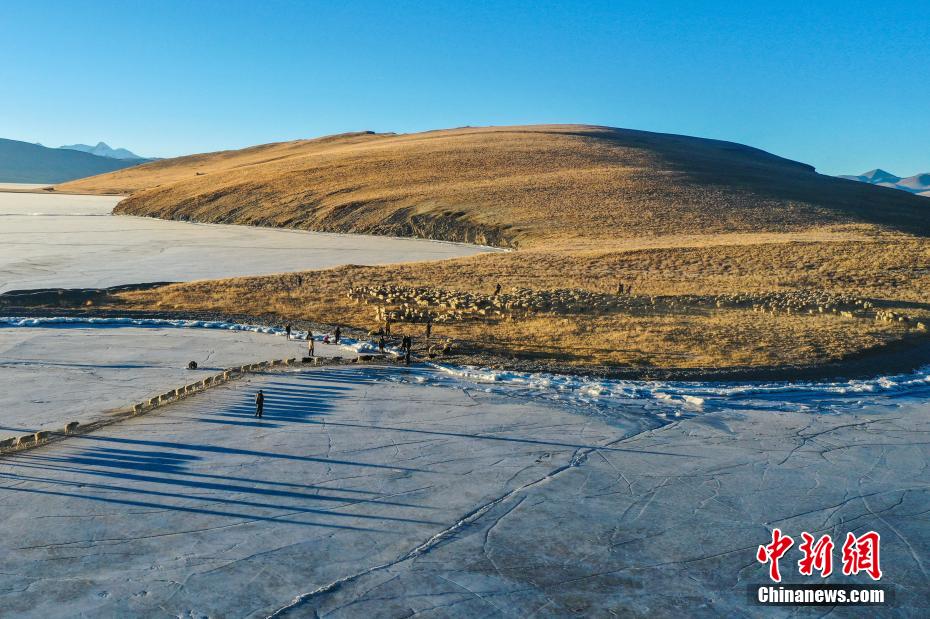 2月7日,西藏山南市浪卡子縣推瓦村1000多只羊通過普莫雍錯冰湖,前往湖心島。據(jù)悉,位于西藏山南市浪卡子縣的推瓦村,平均海拔約5070米,是世界上海拔最高的行政村,以牧業(yè)為主。由于推瓦村海拔高、夏季短,草場無法為羊群提供充足的過冬飼料,因此,每年高原最冷的時候,推瓦村牧民會把羊群趕到普莫雍錯水草豐茂的湖心島,依靠島上的草料度過最寒冷的冬期。圖為羊群到達湖心島。(無人機照片)