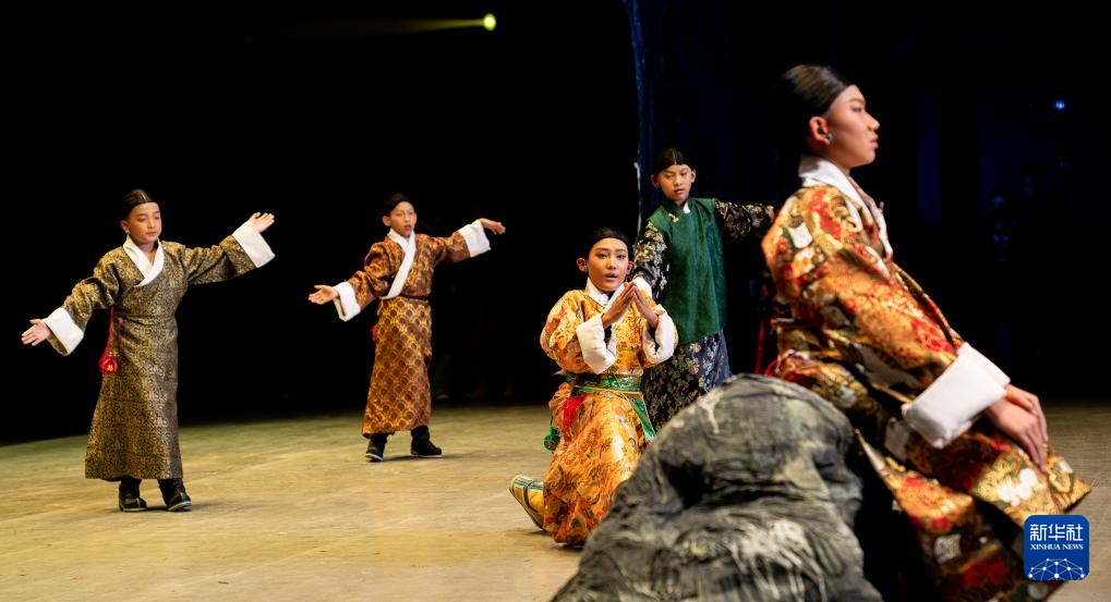 ?西藏首部少兒舞臺(tái)劇藏戲《頓月頓珠》演出現(xiàn)場(chǎng);羅桑朗覺(jué)(右)飾演“頓月”,旦增夢(mèng)朗(左)飾演“頓珠”(2月11日攝)。新華社記者 丁增尼達(dá) 攝?