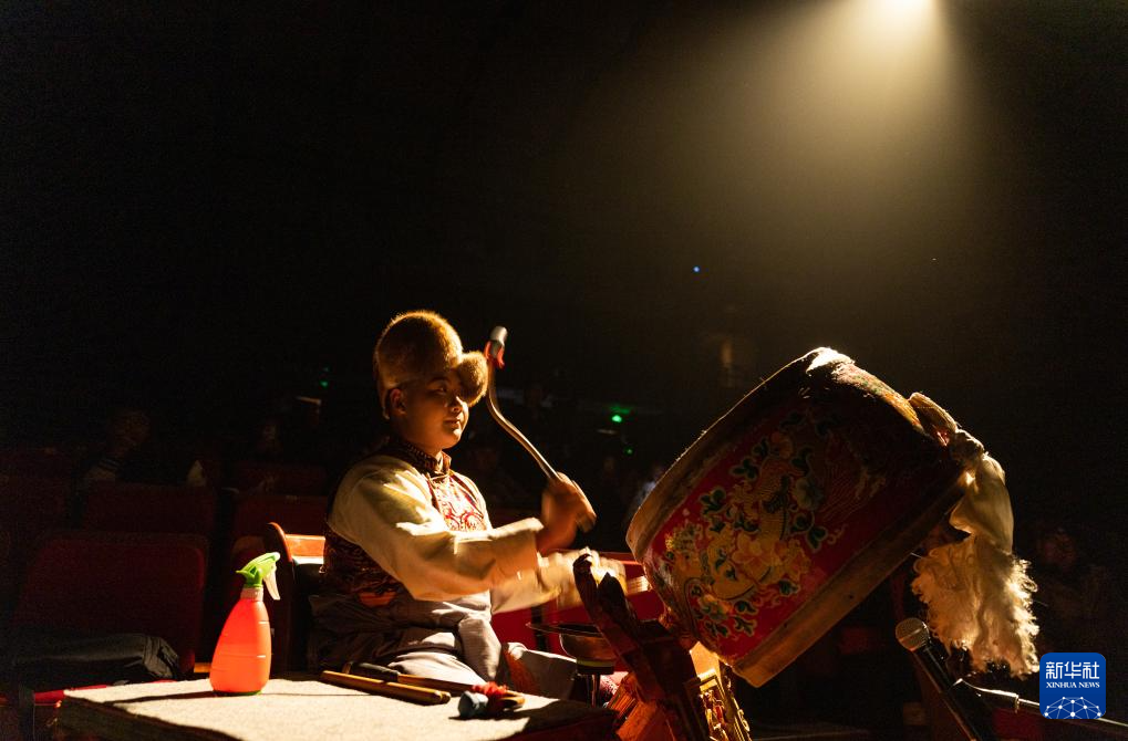 小演員敲鑼打鼓為藏戲表演伴奏(2月11日攝)。新華社記者 丁增尼達(dá) 攝?