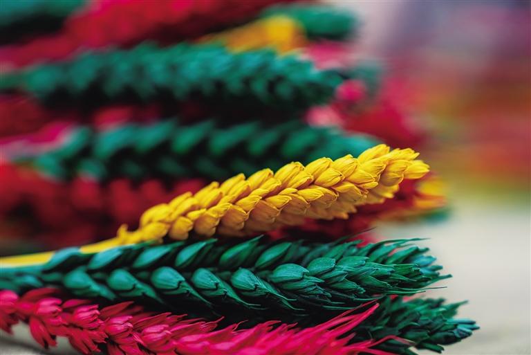 從春耕、夏耘、秋收到冬天的染色、晾干、捆綁、售賣,“羅薩梅朵”的制作過程并不簡單,種植和上色都極其辛苦。卓瑪次仁告訴記者:“每年4月,我們開始種植小麥和青稞,澆水施肥。9月收割時,我們會挑選顆粒飽滿的麥穗和青稞穗,捆綁后去皮曬干。10月,將它們收入屋中,一層層壘起來,房間最好朝陽且沒有老鼠。11月,開始采購顏料和捆扎用的毛線。”