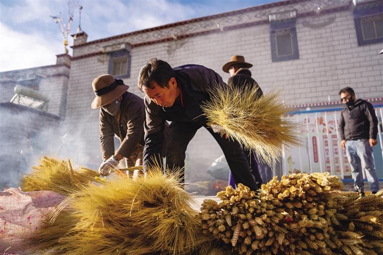 每年12月起,桑木村處處可見“羅薩梅朵”。清晨,天還未亮,村民們就已忙碌起來。有人將制作好的“羅薩梅朵”打包送往拉薩市區(qū)售賣,有人則繼續(xù)為剩下的麥穗和青稞穗上色、曬干?!拔覐男】粗L輩們制作‘羅薩梅朵’,7歲就開始幫忙捆綁,20歲開始獨立制作。每到這個時候,我就知道新年快到了?!?4歲的村民卓瑪次仁回憶道。