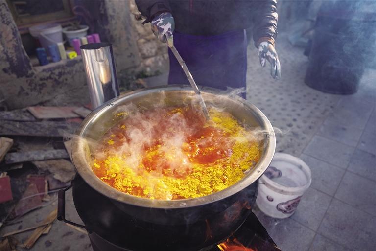 “玫紅色和黃色的都做完了吧?這個顏料水我倒了,開始準備制作青色?!币慌?,61歲的央金將盆洗干凈,繼續(xù)煮水放入顏料?!啊_薩梅朵’有青色、綠色、玫紅色、黃色四種顏色,其中青色耗時最長,不僅需要自己調制,而且最難上色。”央金說,“我們一般是早上7點開始上色,上完色都快下午4點了?!?/p>