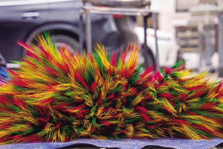 “銷量好的時候一天可以賣近1000元,一般的時候也有500元左右?!毖虢鹱屑殭z查著剛染好色的“羅薩梅朵”,她的手和臉因長時間接觸顏料而沾滿色彩。“以前‘羅薩梅朵’的顏色并不多,只有玫紅色,上色不均勻也沒人會說什么。但現(xiàn)在,顏色必須亮麗、均勻,這也體現(xiàn)了大家生活越來越好,生活品質越來越高?!毖虢鹦χf。