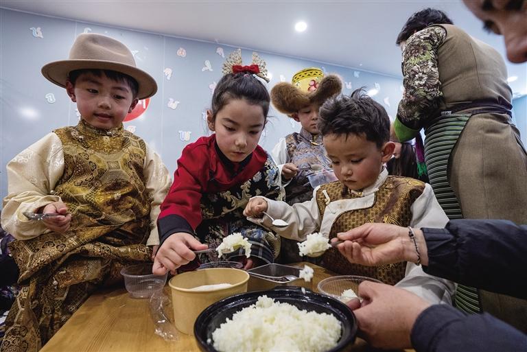 諾諾兒童藏裝派對(duì)上,孩子們正在制作人參果酥油飯。