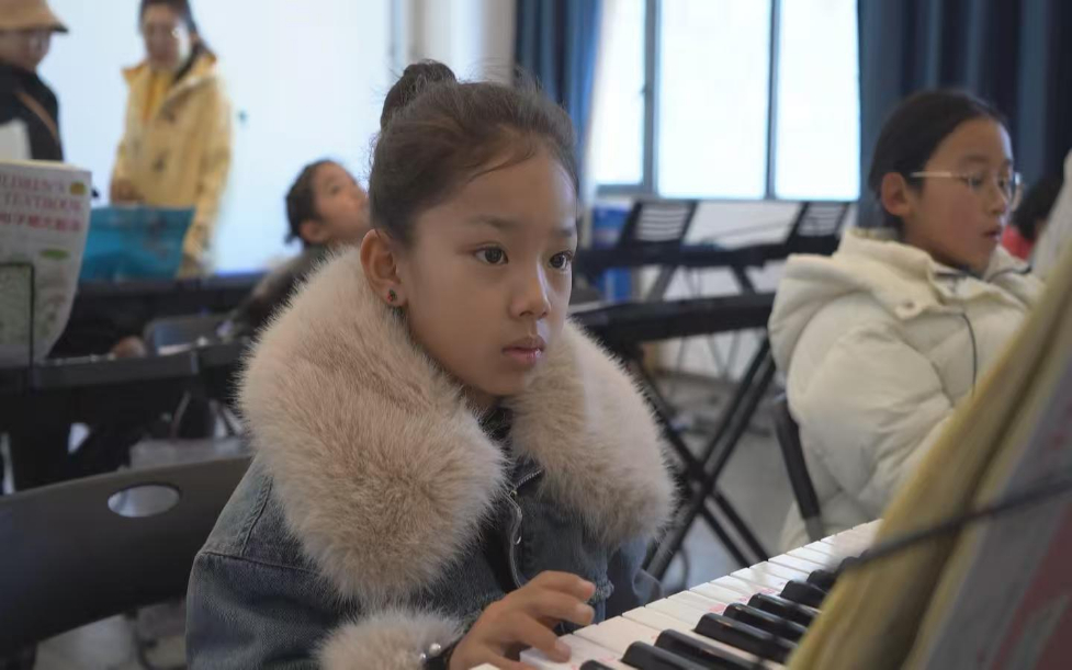 15日,一名孩童在西藏青少年興趣培訓班學習彈奏鋼琴。(西藏青少年實踐教育基地供圖)
