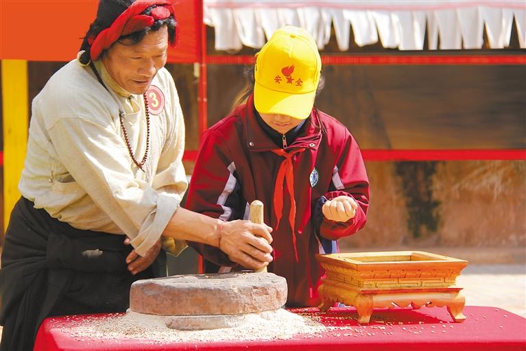 圖為昌都市芒康縣洛尼鄉(xiāng)手藝人指導(dǎo)學(xué)生手磨糌粑。 通訊員 董毅 攝