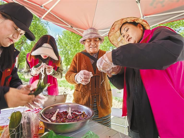 5月29日,日喀則市舉行喜迎西藏自治區(qū)成立60周年暨“我們的節(jié)日·端午”主題活動(dòng),以節(jié)日為媒,將鑄牢中華民族共同體意識(shí)宣傳教育融入傳統(tǒng)節(jié)慶?;顒?dòng)中,自治區(qū)十佳宣講員平措用通俗易懂的語(yǔ)言,為現(xiàn)場(chǎng)市民群眾講述端午節(jié)的由來(lái)和美食、習(xí)俗等小知識(shí);志愿者們聲情并茂地誦讀《端午詠屈原》、《端午情懷》、《屈子頌》等經(jīng)典作品,贏得陣陣掌聲。市民群眾興致勃勃地參與旱地龍舟趣味小游戲、端午節(jié)知識(shí)有獎(jiǎng)競(jìng)答,包粽子、制香囊,在歡聲笑語(yǔ)中感受傳統(tǒng)文化的魅力。在定結(jié)縣扎西崗鄉(xiāng),災(zāi)后重建施工隊(duì)和村民代表歡聚一堂,頓珠次仁等群眾自發(fā)彈起扎念琴,施工隊(duì)代表也上臺(tái)傾情獻(xiàn)唱,其樂(lè)融融。在薩迦縣新時(shí)代文明實(shí)踐中心,歌舞、戲曲、小品等節(jié)目輪番上演,讓縣特困供養(yǎng)中心老人們享受到了一場(chǎng)視聽盛宴。