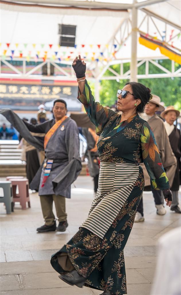 踢踏聲中,老人們甩掉了腰酸腿痛,年輕人驅(qū)散了工作疲憊。鮮艷的藏裝旋出歡樂弧線,嘹亮的歌謠唱出心底喜悅。藏裝翻飛如彩蝶,歌聲清亮繞湖岸,每一個(gè)旋轉(zhuǎn)都盛滿笑意。