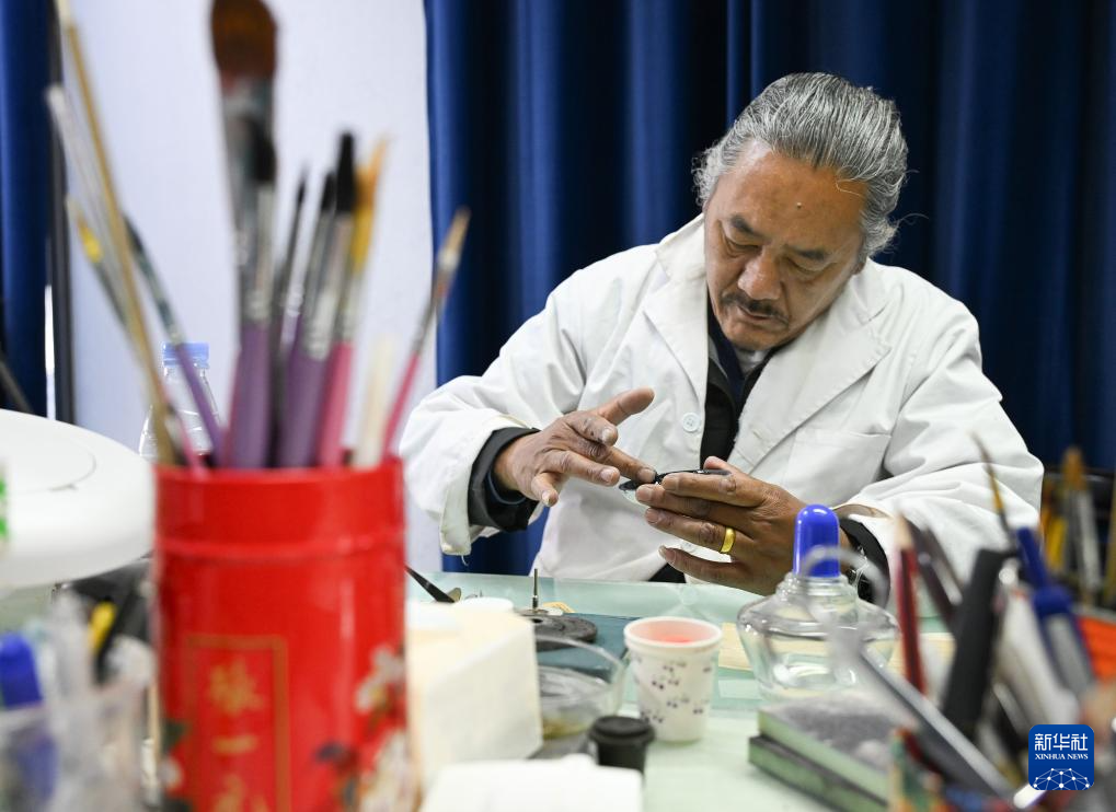布達(dá)拉宮貝葉經(jīng)實(shí)驗(yàn)性修復(fù)小組實(shí)驗(yàn)室工作人員對(duì)用于貝葉修復(fù)的顏料進(jìn)行研磨處理(5月25日攝)。新華社記者 旦增尼瑪曲珠 攝 ??