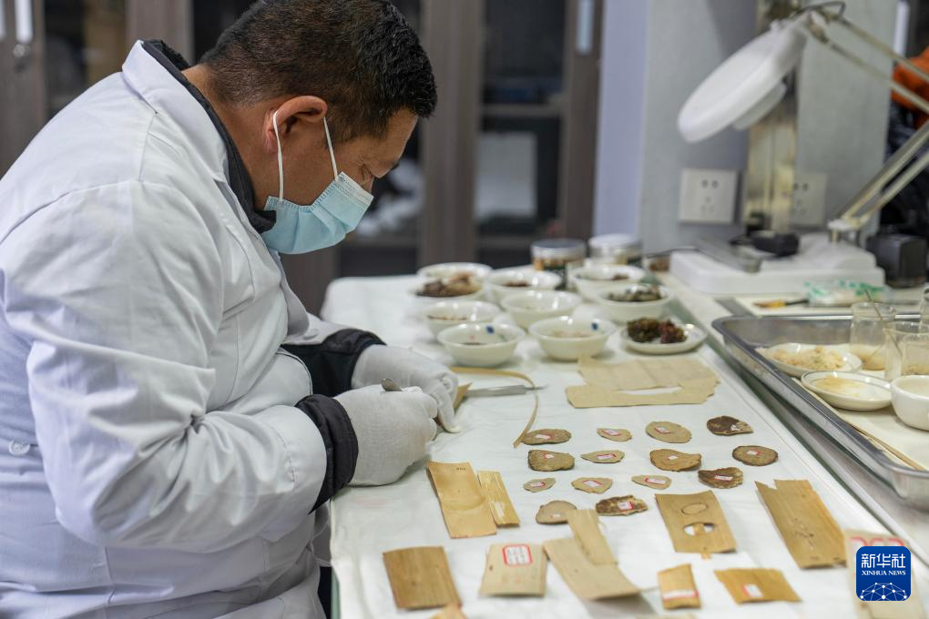 布達(dá)拉宮貝葉經(jīng)實(shí)驗(yàn)性修復(fù)小組實(shí)驗(yàn)室工作人員對(duì)貝葉進(jìn)行處理(5月25日攝)。新華社記者 李賀 攝 ??