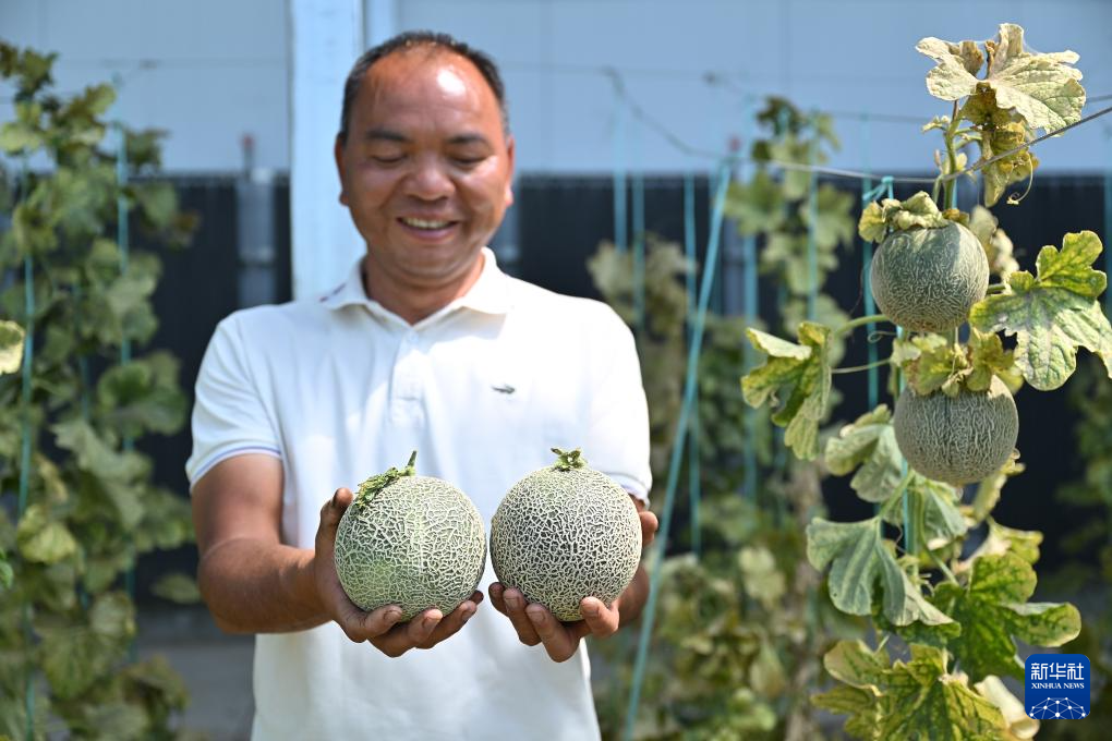 7月19日,農(nóng)業(yè)技術(shù)人員在大棚內(nèi)展示網(wǎng)紋蜜瓜。新華社記者 李鑫 攝