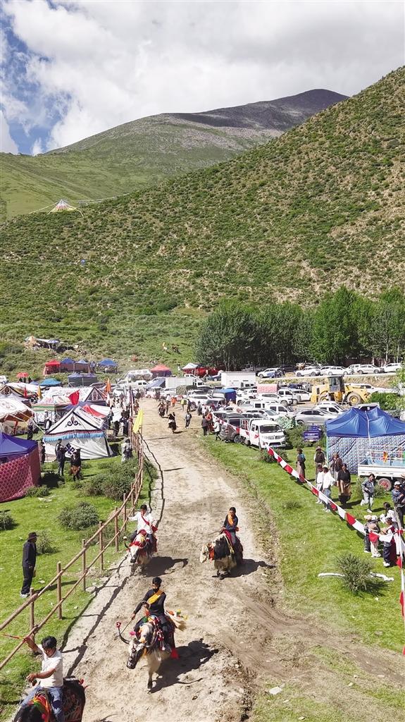 隨后登場(chǎng)的賽牦牛更是將氣氛推向高潮。這些被精心裝扮的牦牛,頭戴彩飾,頸掛銅鈴,在主人的駕馭下邁著既穩(wěn)健又不失迅猛的步伐沖向終點(diǎn)。與賽馬的靈動(dòng)不同,賽牦牛更顯沉穩(wěn)有力,銅鈴聲與觀眾的吶喊聲交織在一起,充滿了濃郁的鄉(xiāng)土氣息。參賽選手次仁笑著說:“這頭牦牛我養(yǎng)了五年,每年就等這一天證明它的實(shí)力!”