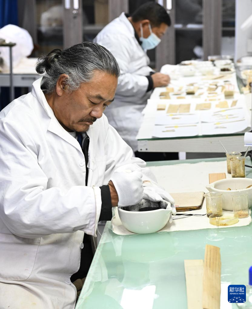 5月25日,布達(dá)拉宮貝葉經(jīng)實(shí)驗(yàn)性修復(fù)小組實(shí)驗(yàn)室工作人員在對(duì)用于貝葉修復(fù)的顏料進(jìn)行研磨處理。新華社記者 旦增尼瑪曲珠 攝