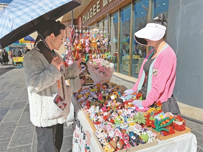 4月初,拉薩天海國際廣場的街頭,一輛擺滿鉤織好物的小推車總引得行人駐足。軟萌的玩偶、實用的杯墊、精致的酥油茶杯套……件件手作皆藏匠心,攤主林楊陽和她的學(xué)員,便是這些指尖好物的創(chuàng)造者。