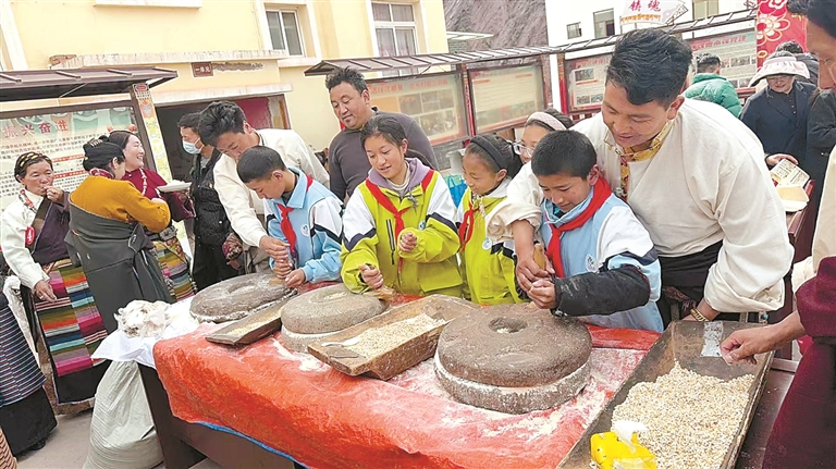 圖為學生在體驗磨糌粑。記者 平措郎加 攝