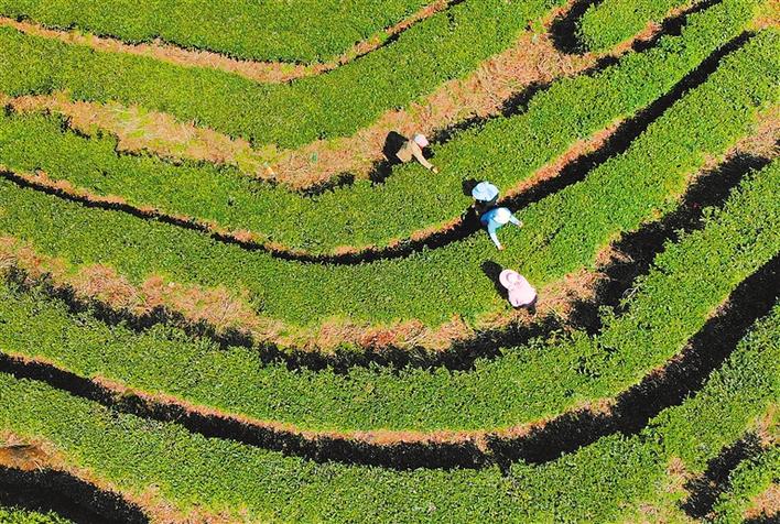 氣溫回暖,蟄伏了一個(gè)冬天的春茶早已迫不及待地吐出新綠。一片片小小的茶葉是村民手中的“金葉子”,一壟壟整齊的茶園成為當(dāng)?shù)厝罕姷摹熬蹖毰琛保鼈儞纹鹆宿r(nóng)民增收、農(nóng)村富裕、脫貧攻堅(jiān)的一方天地。