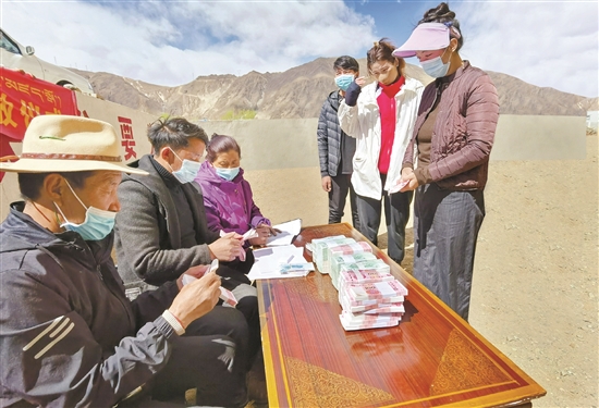 圖為康樂小區(qū)易地扶貧搬遷群眾勞務(wù)費發(fā)放現(xiàn)場。 拉薩融媒記者 喬 梁攝